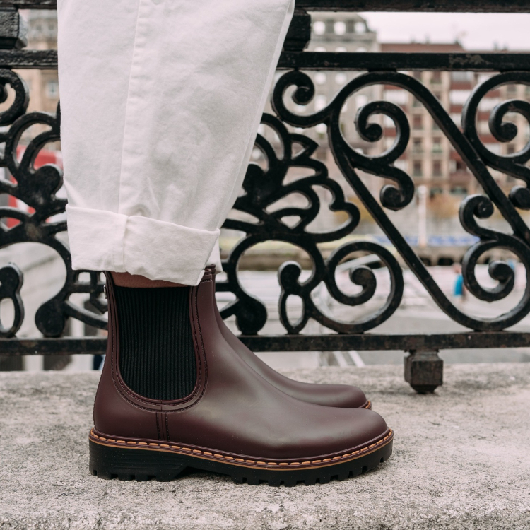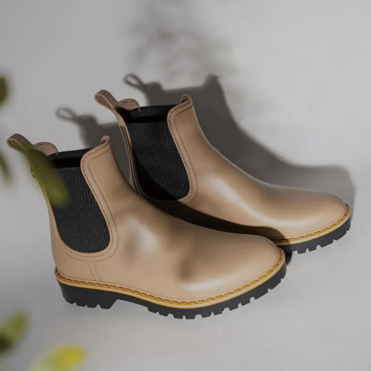 - 經典霧面鞋身搭配黃色車線,俐落時髦!西班牙製,舒適彈性的天然橡膠及鬆緊穿脫設計,顛覆雨鞋只能狼狽拔河脫去還有硬底難走的印象!